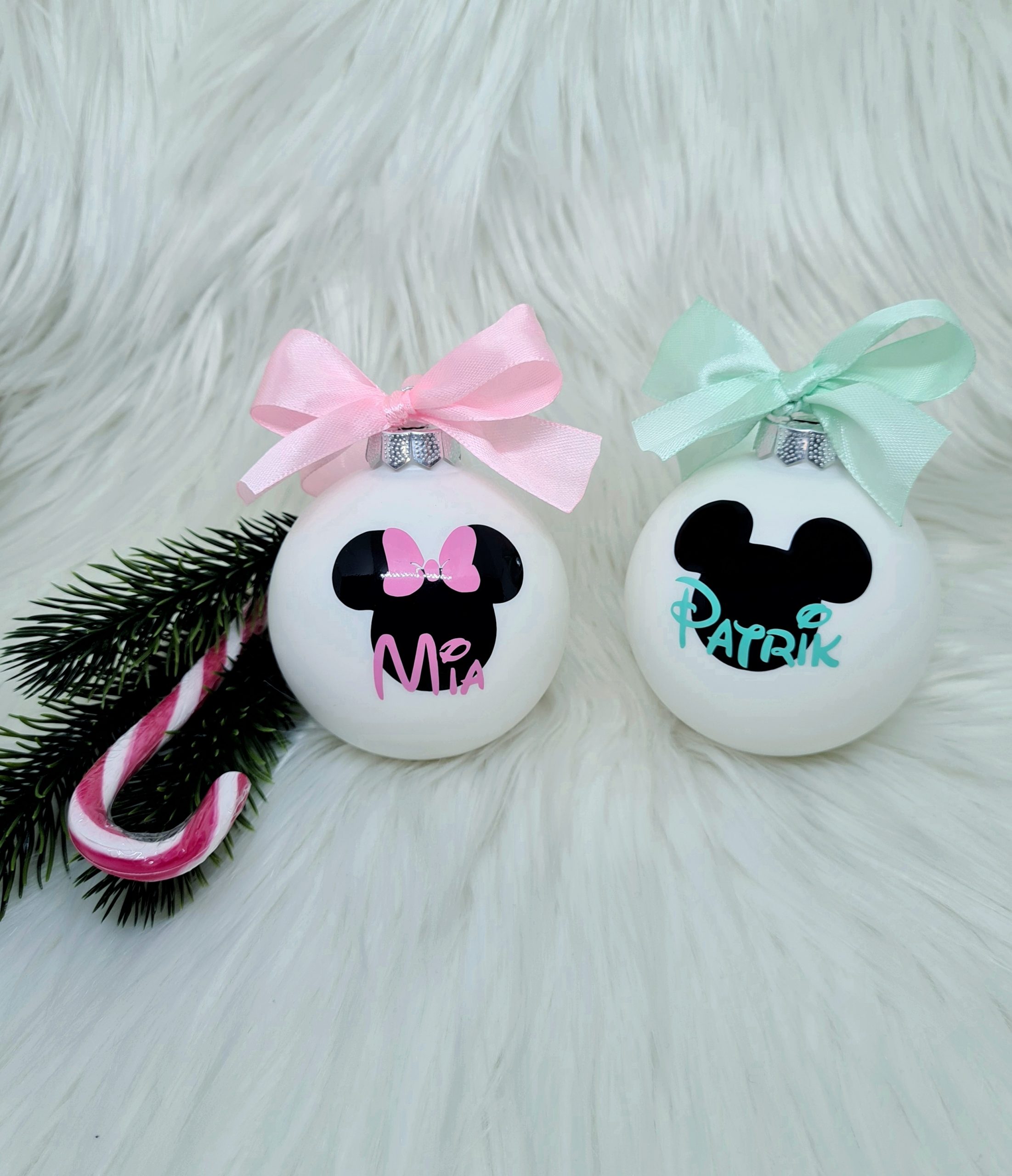 Personalizirana bunkica bela- okrasek za smrečico: Minni in Mickey miška